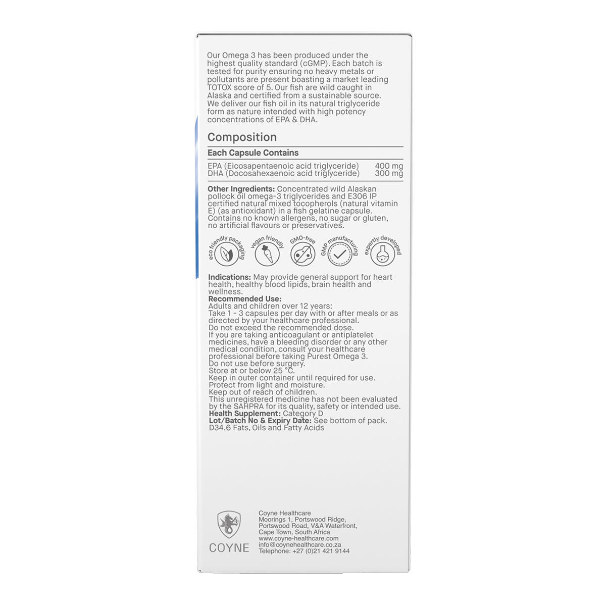 Coyne Healthcare Purest Omega 3 Wild Alaskan Fish uses the latest innovation and EPA/DHA technology to ensure purity and absorption. In developing Purest Omega Coyne Healthcare have collaborated with a world leading authority and expert in Omega 3 production. Their oil boasts the world’s leading TOTOX score, which measures oxidation, meaning they guarantee you the freshest and purest Omega 3 on the worldwide market.