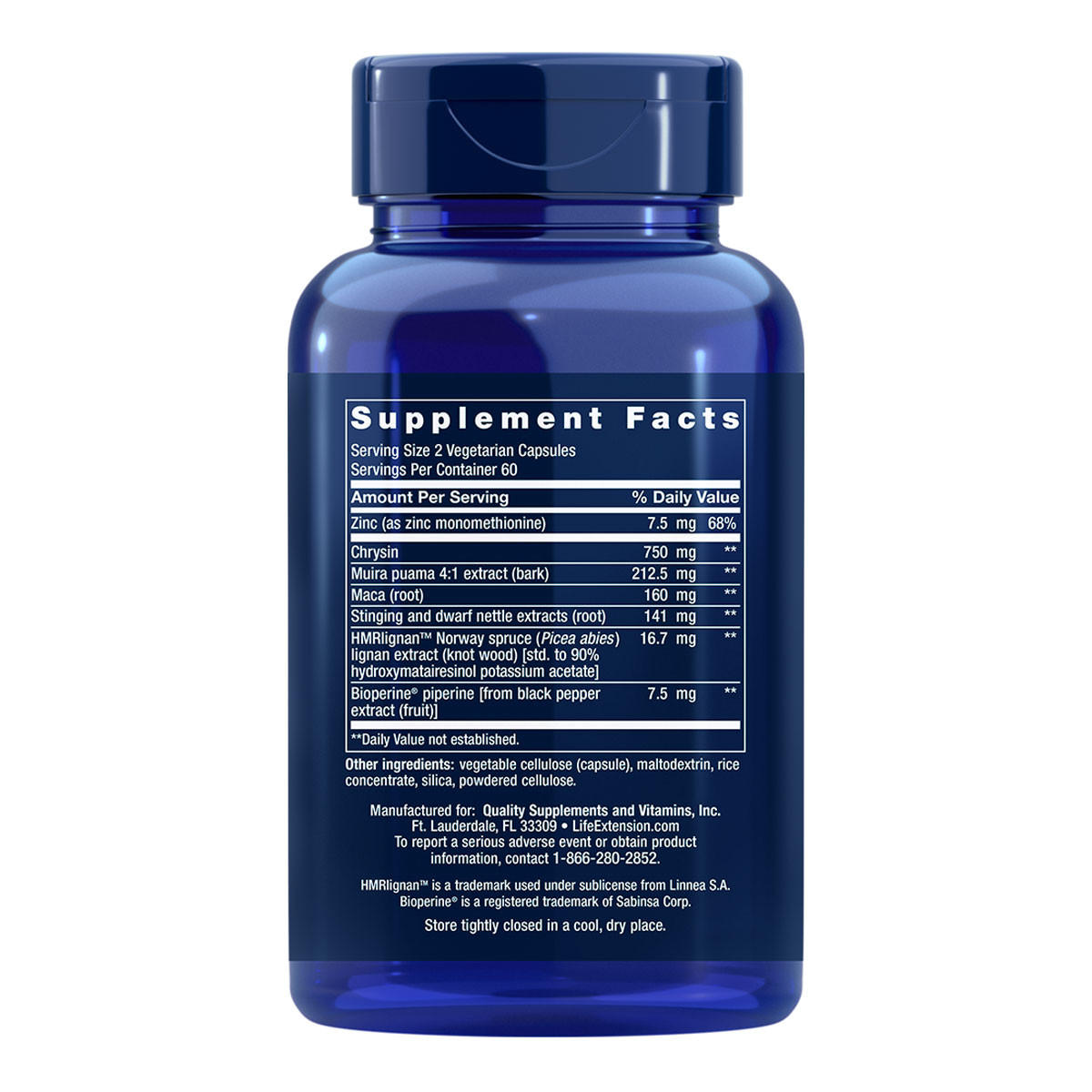 Life Extension Super Miraforte with Standardized Lignans supports healthy levels of free testosterone and overall male health with potent minerals and extracts including chrysin, nettle root, Muira puama and more.
