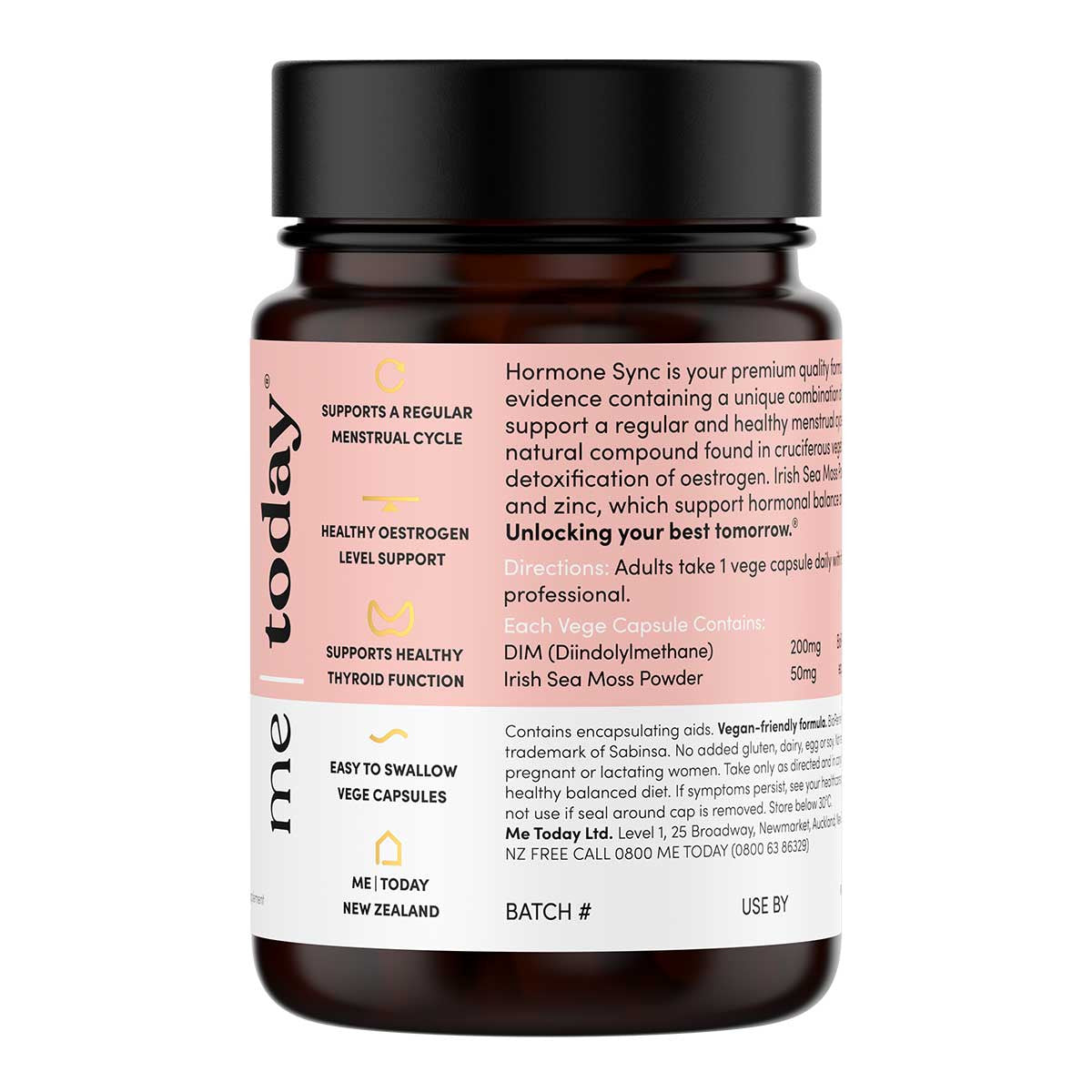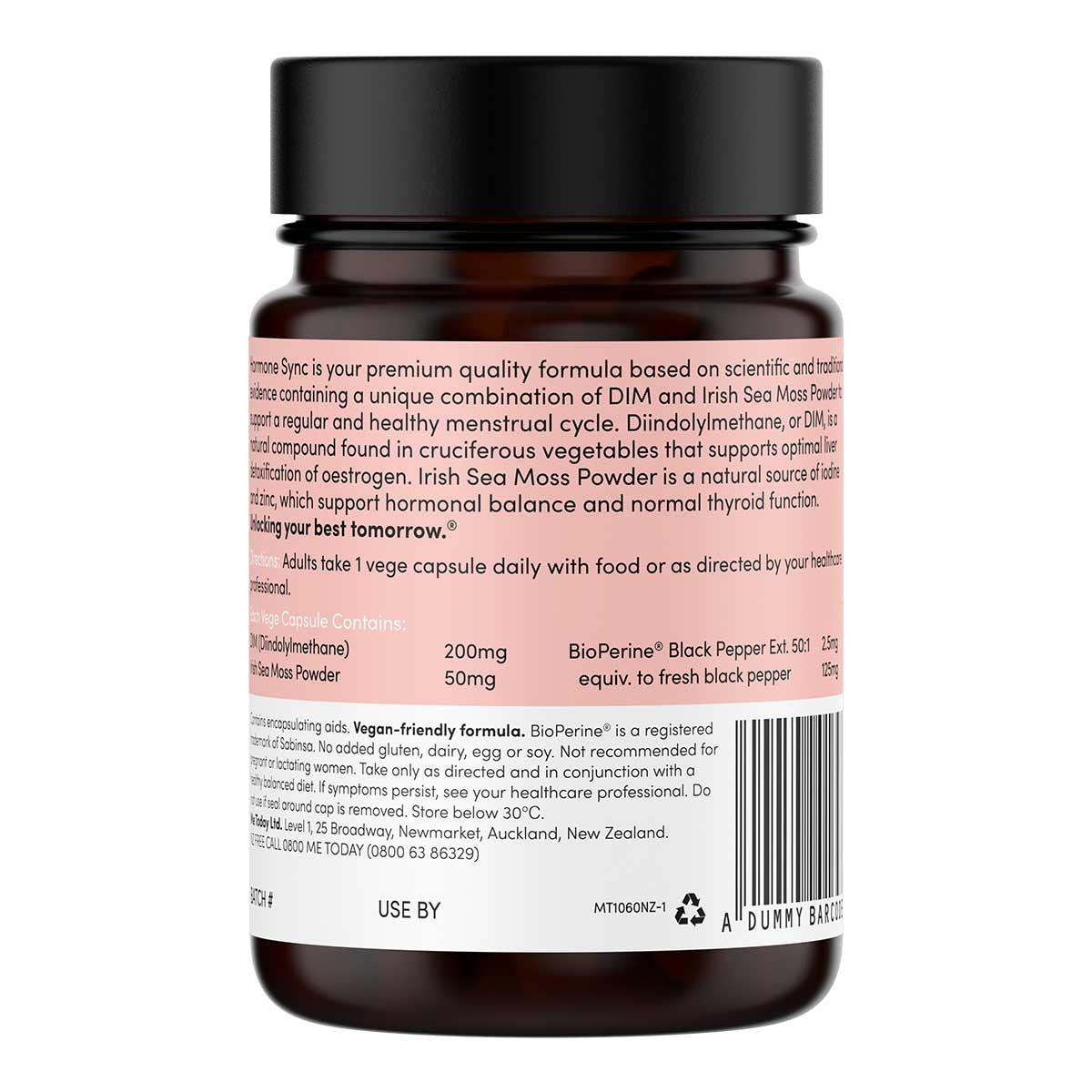 Me Today Hormone Sync is your premium quality formula based on scientific and traditional evidence containing a unique combination of DIM and Irish sea moss powder to support a regular and healthy menstrual cycle. Diindolylmethane, or DIM, is a natural compound found in cruciferous vegetables that supports optimal liver detoxification of oestrogen. Irish sea moss powder is a natural source of iodine and zine, which support hormonal balance and normal thyroid function.