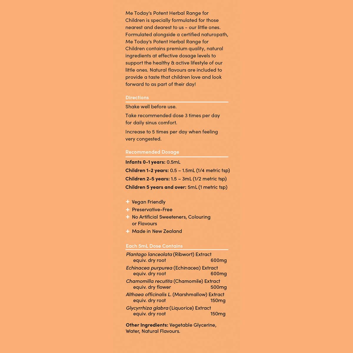 Me Today Potent Herbal Children's Sinus Soothe & Clear is your premium quality formula based on scientific and traditional evidence to support clear sinuses and soothed throats, naturally.