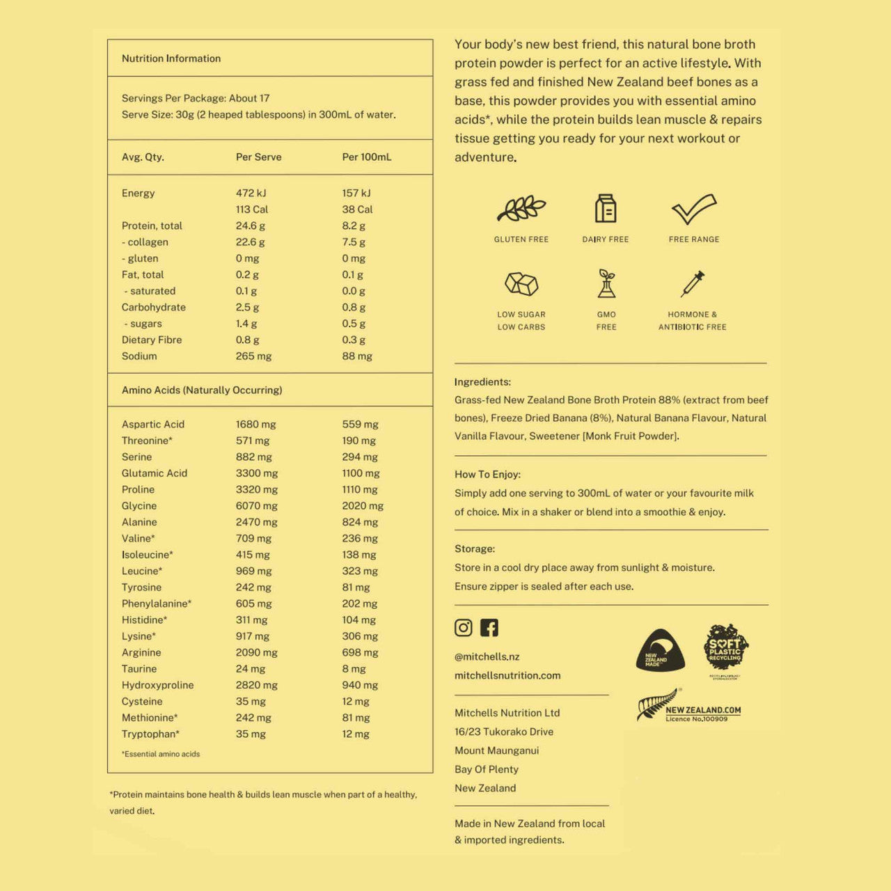 Mitchells Nutrition Bone Broth Protein Powder - Banana: Multi-functional 100% grass-fed bone broth protein powder is the most natural and easily digestible source of protein. Naturally packed with collagen and essential amino acids, it’s ideal for any age, at any stage. Each serve delivers 25g of protein to support your active lifestyle, helping build lean muscle and repair tissue so you’re ready for your next workout or adventure.