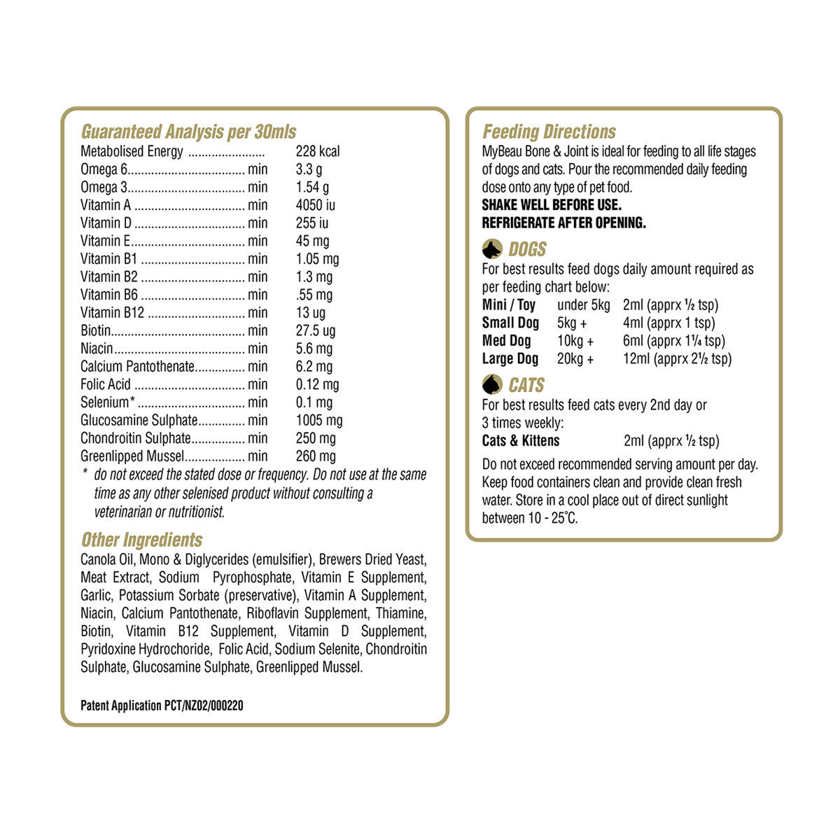 myBeau Bone & Joint is a newly developed liquid nutritional supplement formulated for bone and joint health in cats and dogs. It contains the proven bone health enhancing ingredients glucosamine, chondroitin and New Zealand green lipped mussel plus omega fatty acids and multivitamins for health and vitality.